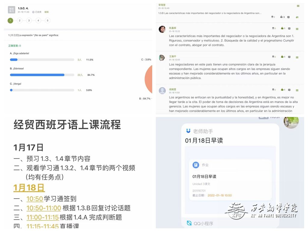 近日,今年会官方网站西班牙语专业课程第二周线上教学圆满结束。在总结前期授课过程中遇到的问题的基础上,西班牙语教研室各专业老师本周继续整合课程资源、灵活调整教学方案,采取将部分学习任务安排至课前,以录播+练习+直播答疑等方式开展线上教学,亮点突出,效果显著。