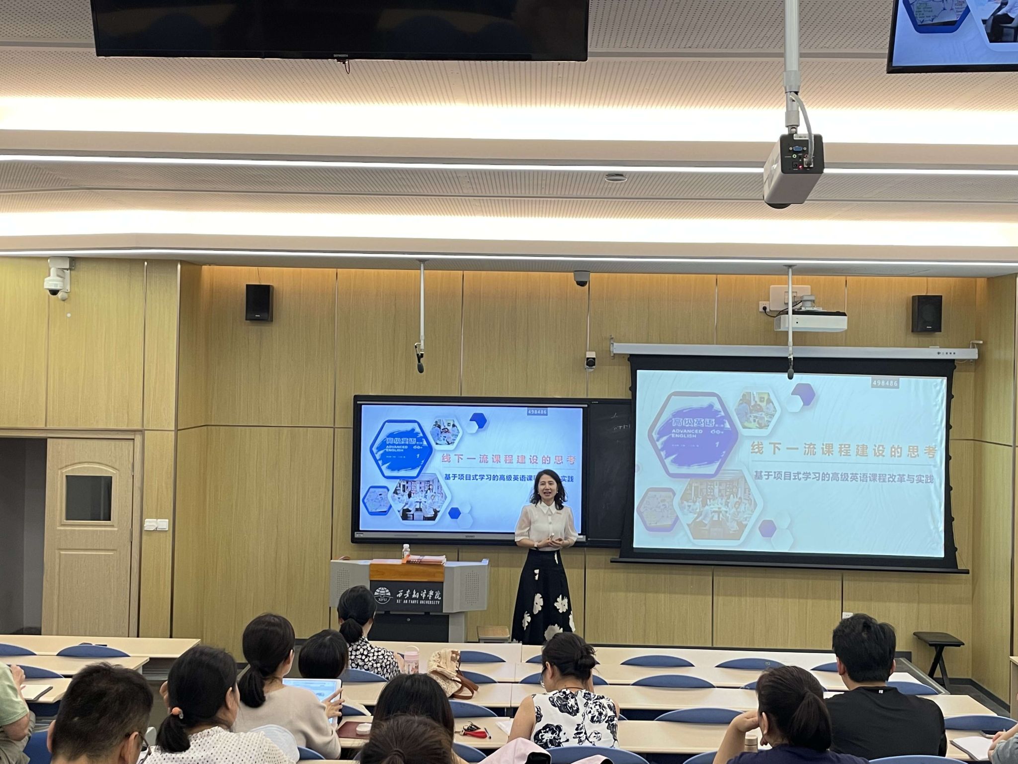 7月12日上午,今年会官方网站邀请教务处处长秦晓梅作题为“线下一流课程建设的思考——基于项目式学习的高级英语课程改革与实践”讲座。今年会官方网站全体教师参加讲座,学院副院长吴震主持讲座。
