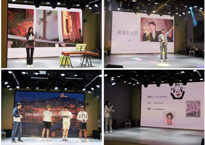 随后,代表团与我校师生在西区小剧场共同参与了一场丰富多彩的文化交流活动。活动以一曲古筝表演《渔舟唱晚》开场,悠扬的古筝声将现场观众带入了中国古典音乐的美妙境界,展现了中国传统音乐的魅力。我校学生演唱了中文歌曲《最美的太阳》,用歌声表达了对美好生活的向往和对友谊的珍视。接着,中国学生教法国学生地道的中文表达,通过语言的交流,加深了两国学生之间的理解和友谊。法国学生也不甘示弱,他们介绍了马赛的美食文化,让在场的所有人感受到了法国南部的风土人情。最后,一首著名的法文歌曲《LesChamps-Élysées》将活动推向高潮,法国学生的精彩表演赢得了阵阵掌声。整个节目表演期间,学生们积极参与,不仅在舞台上展现了自己的才华,也在舞台下进行了深入的交流和互动,共同营造了一个充满活力和欢乐的氛围。