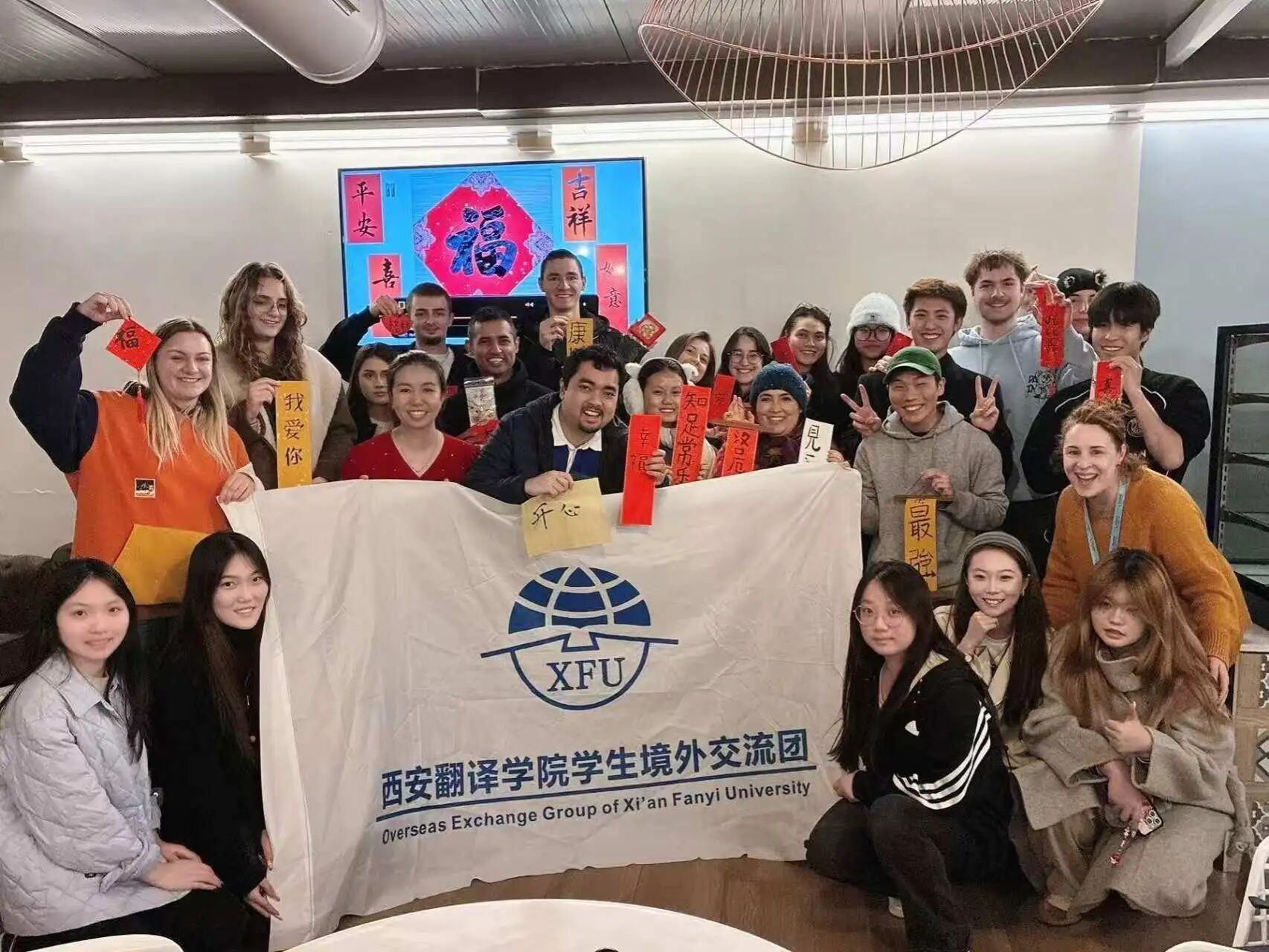 在提升自身语言文化素养的同时,西译学子主动担当起中华文化传播者的角色。游学期间,樊星缨老师应校方邀请,组织了一场别开生面的“笔墨中国”书法文化体验活动。在Hispania学校的咖啡厅,樊老师向各国师生展示并讲解了“文房四宝”,指导他们用毛笔书写汉字。活动吸引了大量师生参与,墨香四溢之间,不仅展现了我院师生的文化自信,也有效促进了中西文化的双向交流与互鉴,成为此次游学活动中一抹亮丽的色彩。