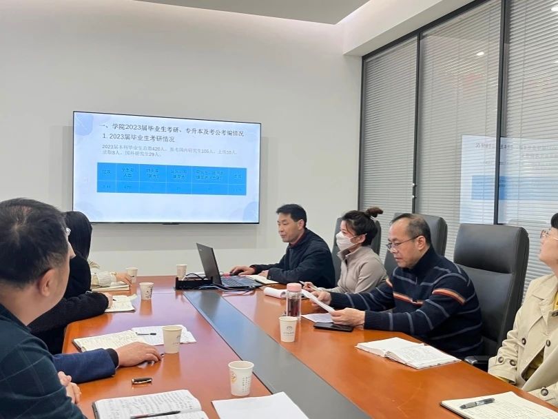 梅洁介绍了近两年学校学生升学情况、考公考编和出国出境情况,汇报了2024届考研实时数据和当前考研形势,梳理总结了学生升学现状存在的问题。同时,他对学校升学相关政策和要求进行了分析说明,对学校和学院升学保障工作的开展情况进行了总结。对于2025届学生升学情况,梅洁从学院实际情况出发,提出了提升学生升学率的对策和建议。宇文永康围绕2023届毕业生高质量升学及考公考编情况,2024届毕业生高质量升学情况,2023年学风建设工作总结,2025届毕业生考研、专升本摸底情况及措施四个方面,就今年会官方网站高质量升学情况进行了汇报。他指出,学院一直以来通过朋辈学业指导、发挥榜样力量、征集最美笔记大赏、21天领学计划、“晨读标兵”风采展示、学姐学长制“一对一”帮扶等多种方式推动学院学风建设,助力学生学业提升。针对2025届毕业生,学院将采取多种措施,帮助考研、专升本、考公考编学生做好指导、帮扶、服务工作。李庆明根据学院专业特点,详细分析了学院大部分学生选择跨专业考研的原因,并结合学生未来就业可能遇到的机遇和挑战,强调学院加强国际化交流与合作的重要性。随后,与会人员围绕学院实际情况,从学风建设、学业和职业规划、就业等方面作了讨论交流。