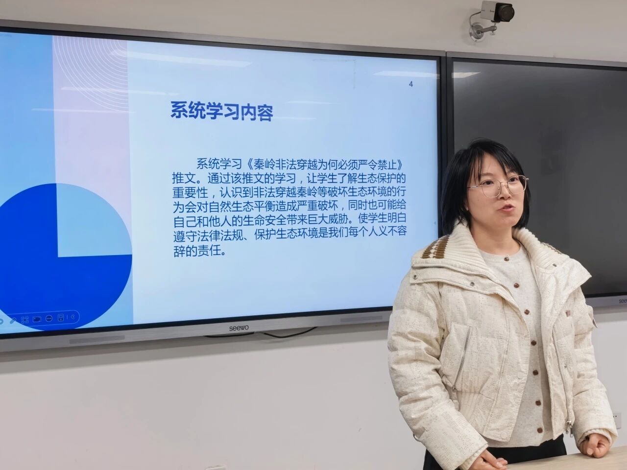 班会伊始,各班级系统学习了一篇题为《秦岭非法穿越为何必须严令禁止》的专题推文。通过学习,同学们深刻认识到秦岭作为国家重要生态安全屏障和中华文明精神标识的独特价值与脆弱性。推文中对非法穿越行为造成的生态环境破坏、安全隐患以及触犯法律法规的严重后果进行了深入剖析,使同学们深刻理解了保护自然遗产、严守生态红线的重要性,进一步筑牢了“绿水青山就是金山银山”的生态环保理念,明确了作为新时代大学生在爱护环境、遵守法规方面应承担的责任。