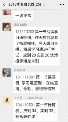 大家要及时督促学生学习,学习主要还是依靠学生自觉、主动,对于学习被动、懒散的学生,娄敏老师主动与家长以及任科老师进行沟通,希望从源头找到学生存在的问题,家校配合对其从思想上进行教育、指导。她发现有少数学生自制力太差,对公共课的思想认识不足以致出现课堂纪律松散,无法达到老师对线上课堂的真正要求。一切的关键在于要让大家把被动学习变为主动学习。作为当代大学生的我们,一定不能荒废时光。