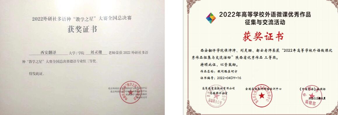 教学获奖不断:德语系教师在教学方面荣获2022外研社多语种“教学之星”大赛全国总决赛三等奖、第四届中国外语微课大赛陕西省三等奖,第三届全国高职高专德语口语技能大赛优秀指导教师奖,校级讲课比赛二等奖2次;指导学生参与大学生创新创业项目获2项省级银奖,4项校级铜奖。