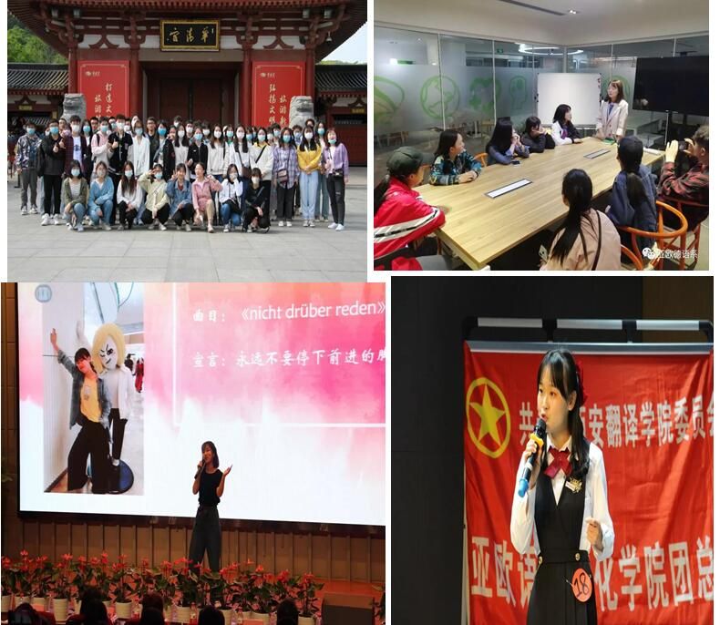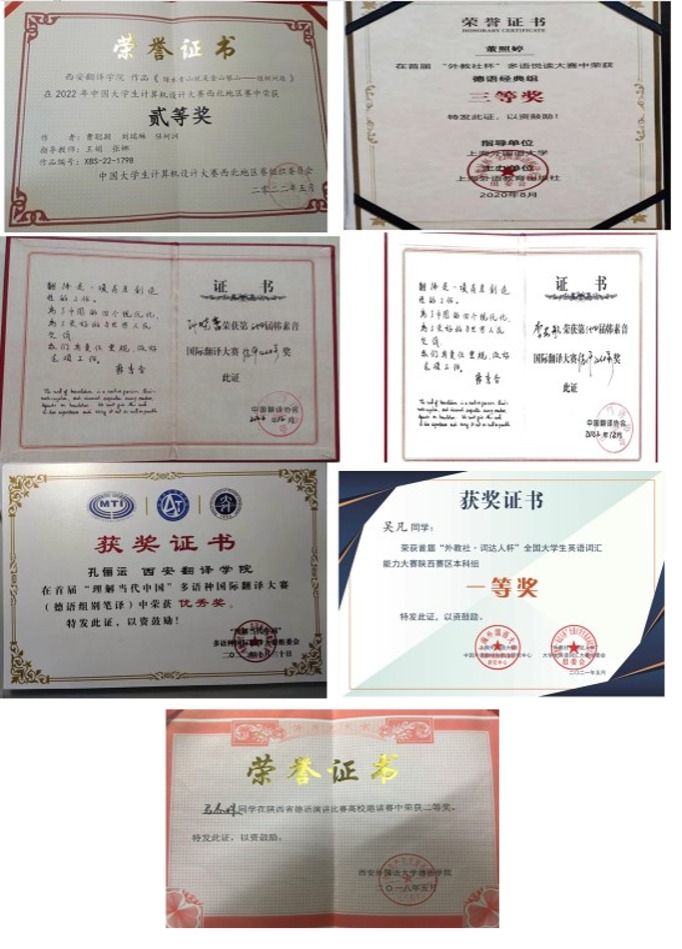 近年来,学生参与校内学科竞赛9项(德语国家国情知识竞赛、 配音大赛、口译大赛 、德语口语大赛、新生演讲赛、“语桥奖”汉语演讲比赛、 德文朗读大赛、德语书法大赛、 德语百词大赛),省级学科竞赛3项(陕西省德语歌曲大赛高校邀请赛、陕西省德语演讲比赛高校邀请赛、陕西省第十七届运动会大学女子甲组(足球)),国家级及省部级学科竞赛6项(首届“外教社杯”多语悦读大赛、第二届“外教社·词达人杯”全国大学生英语词汇能力大赛、 中国大学生计算机设计大赛西北地区赛、2021年全国大学生英语竞赛(NECCS)、 首届“外教社·词达人杯”全国大学生英语词汇能力大赛、韩素音国际翻译大赛、首届理解当代中国翻译比赛)各类学科竞赛总计18项,其中国家级比赛6项,省市级比赛4项。
