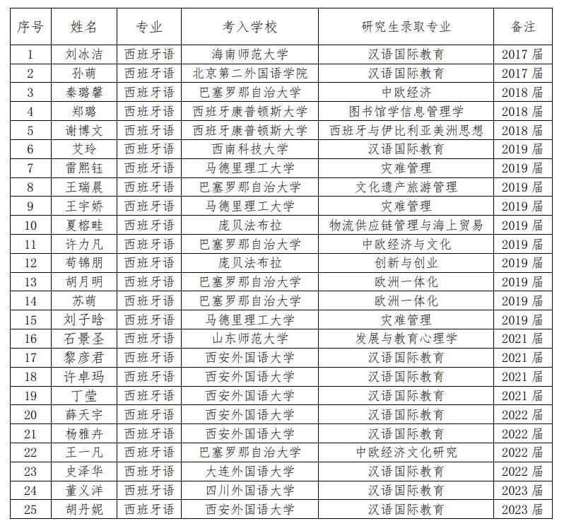 25. 潘荷(2019届), 2019-2020就读于西班牙瓦伦西亚大学语言文学硕士专业,现攻读瓦伦西亚大学高级西班牙语研究博士学位。2018-2022年先后实习于兰州亚成生物科技有限公司、陕西西北国际旅行社有限公司、西班牙瓦伦西亚大学孔子学院、广州博朗翻译服务有限公司等多所机构。