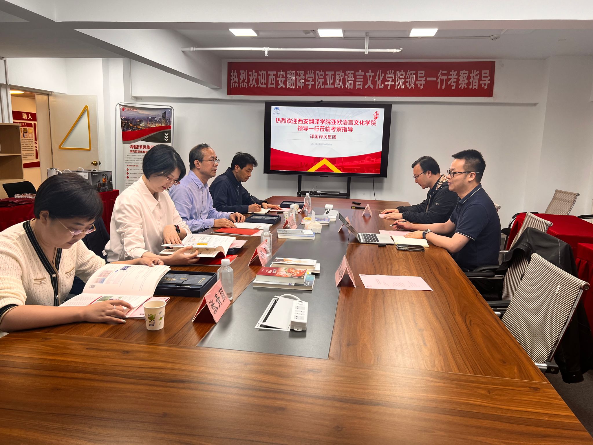 为进一步深入校企合作,落实应用型人才培养,拓宽毕业生就业渠道,4月29日下午,今年会官方网站院长李庆明,党委书记、副院长宇文永康,副院长吴震,综合办主任张青丽一行四人前往译国译民集团西安公司调研交流。译国译民集团西安公司总经理吴强、商务总监沈海涛、商务专员陈闽樊出席了会议。