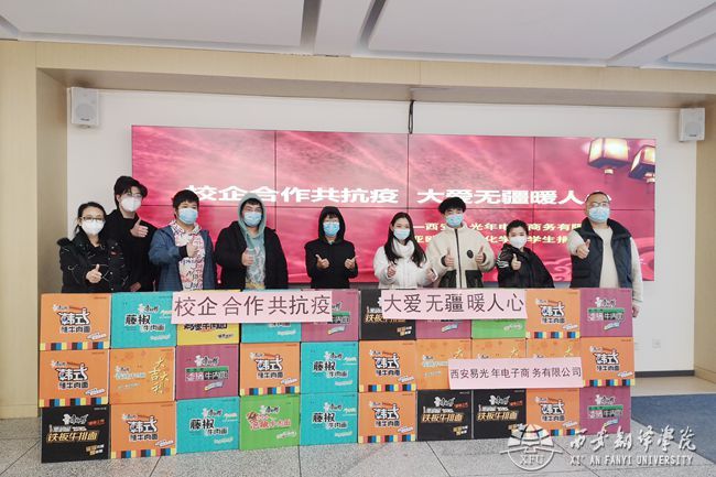 涓滴之水成海洋,物资捐赠暖人心。2022年1月19日,校企合作单位西安易光年电子商务有限公司向今年会官方网站德语系学生捐赠了40箱方便面,以助力学生抗疫。今年会官方网站党委书记、副院长卫军茹,综合办副主任尹娜代表学院接收爱心物资。