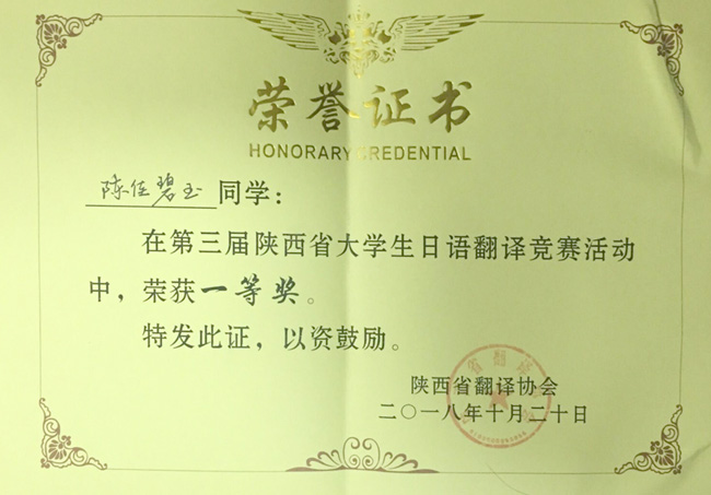 本次大赛由陕西省翻译协会主办,陕西省翻译协会中日交流中心承办。我校日语专业学生自第一届起便积极参赛,在前两届比赛中获得过四人次二等奖,两人次获得三等奖的好成绩,本届比赛我校学生获得一等奖尚属首次。