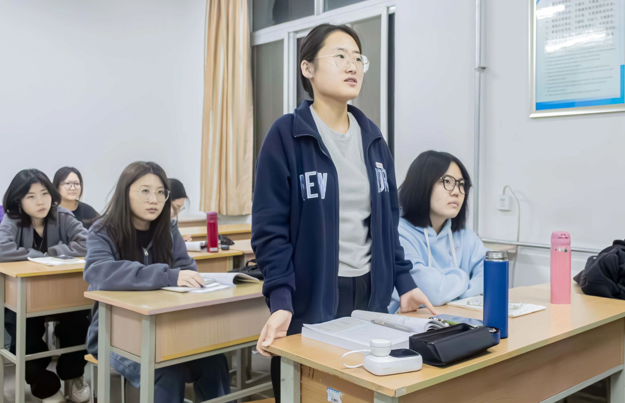 在这个过程中对一些同学进行提问,询问她们对于新时代青年的责任的看法。