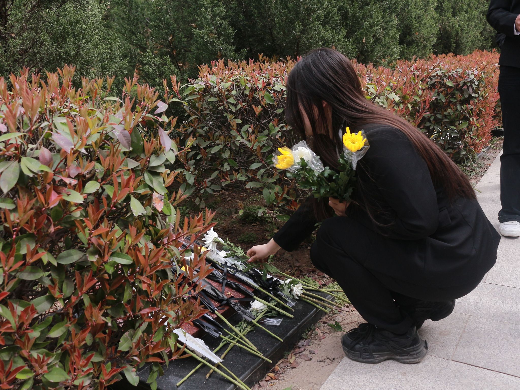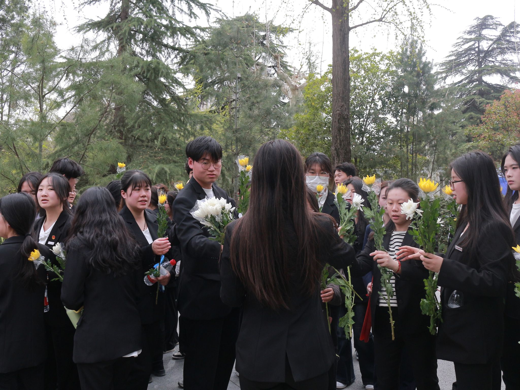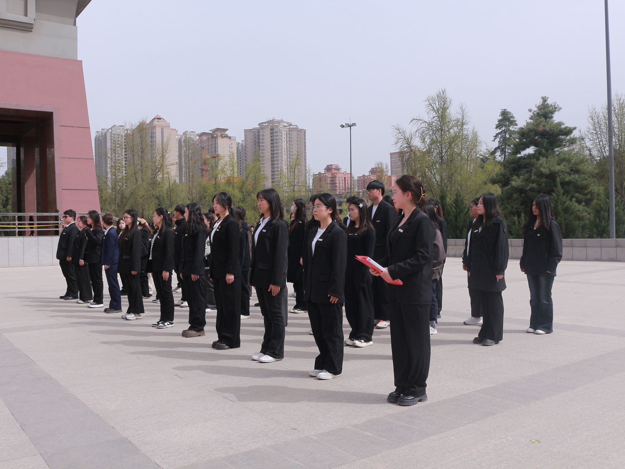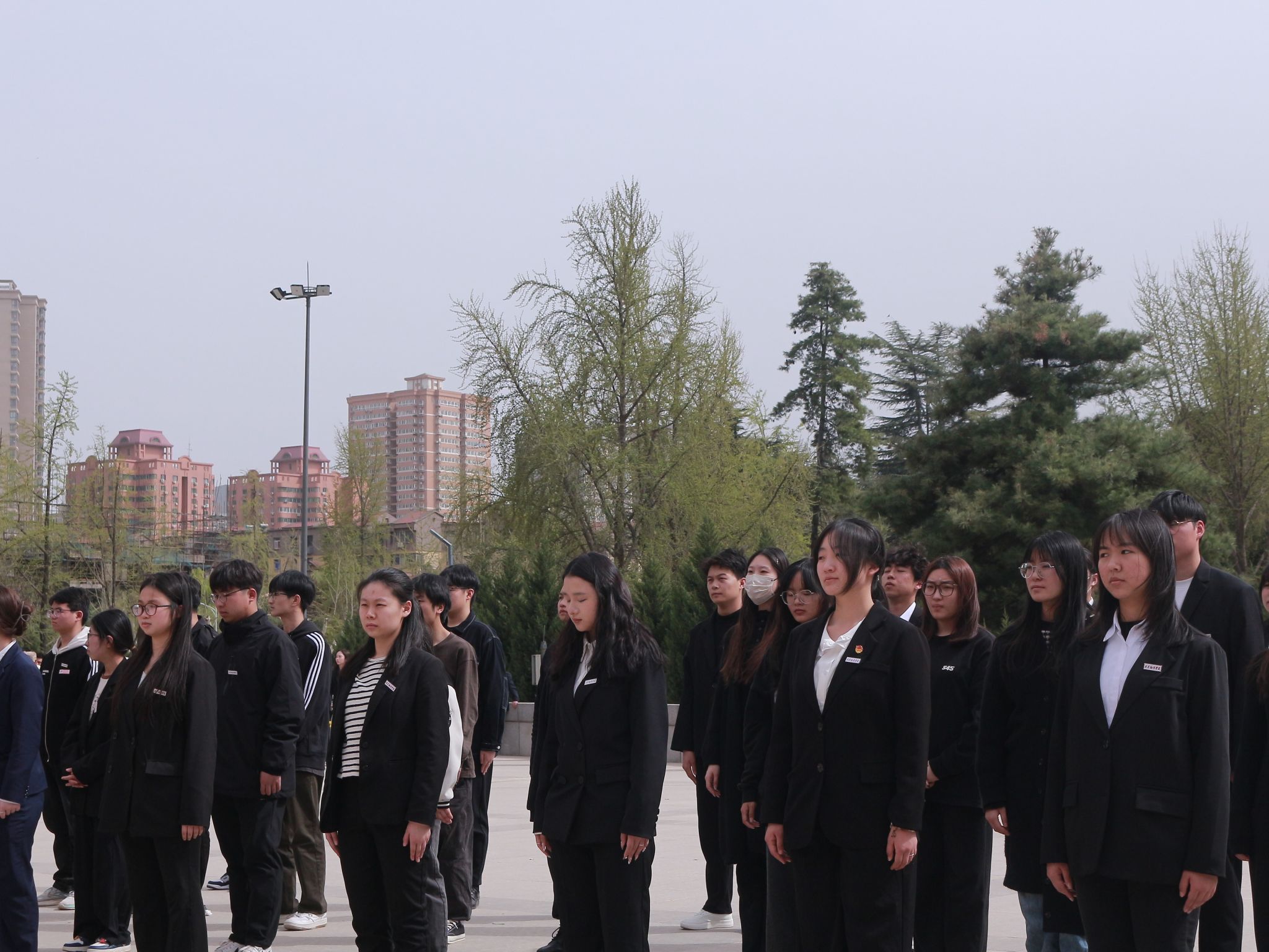同学们给烈士献花以后,在陵园的广场上整齐列队。每个人身姿挺拔,面容凝重,在寂静的陵园中,唯有微风拂过树叶的沙沙声。随着一声庄重的指令,全体同学缓缓弯腰,行鞠躬礼。每一躬,都饱含着对英烈们的深切敬意与无尽感激,腰弯下的角度,是对先辈奉献的崇高致敬。