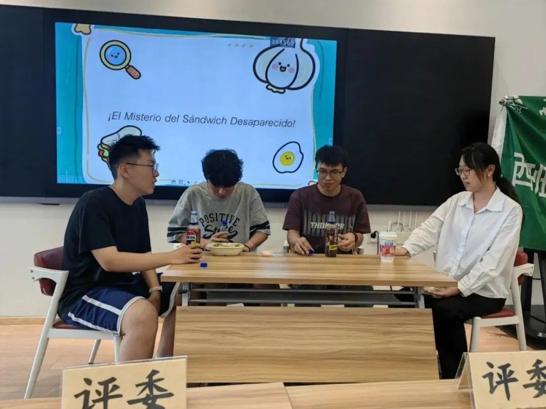 第一组由24级陈圣喆、王晴、刘田一、尹国宁带来,讲诉了桌子上的三明治神秘消失,由一个角色寻找缘由展开的神奇探秘故事。