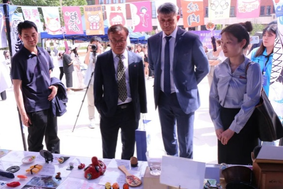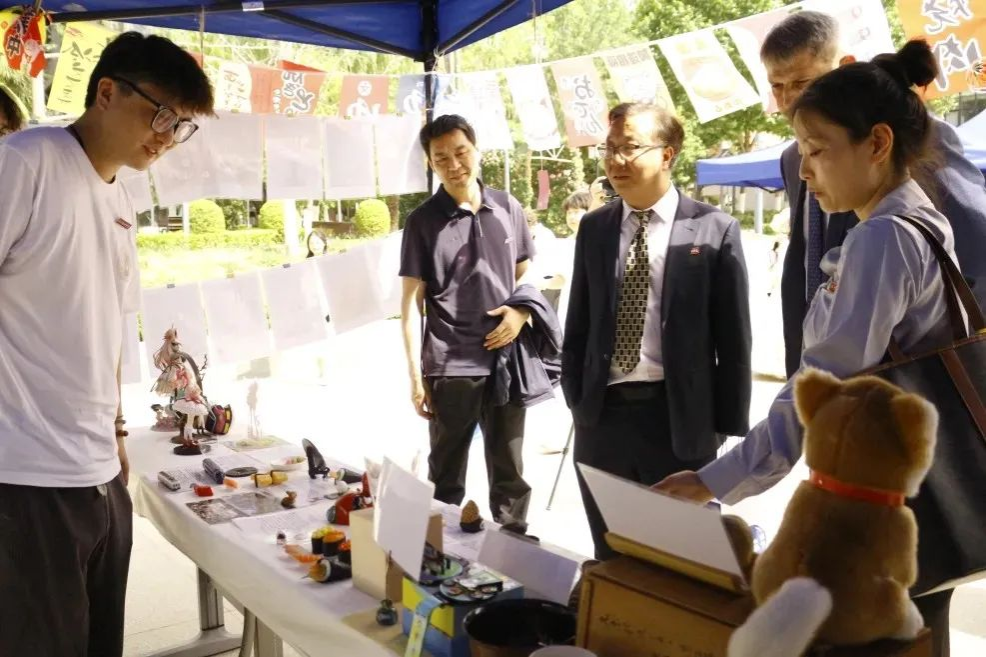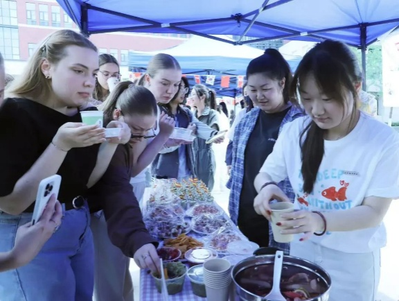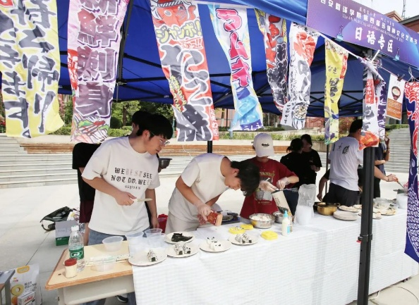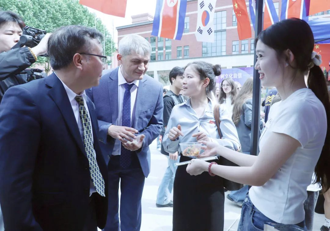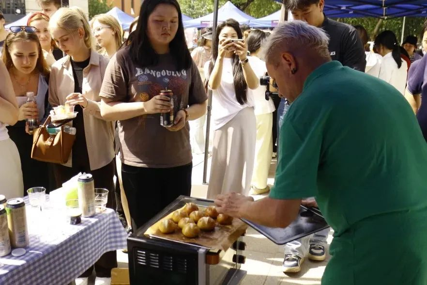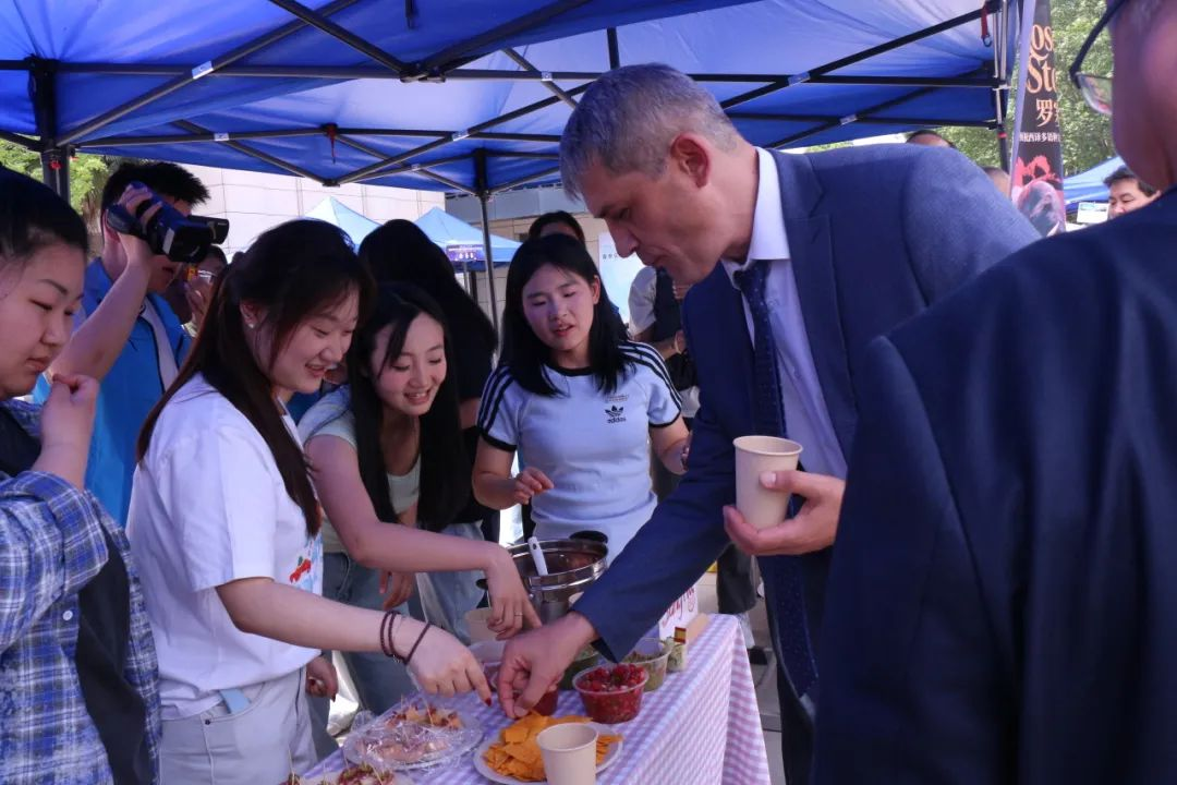 活动来到室外文化体验区,领导们品尝由学生亲手制作的各国特色美食。从精致的日式和果子、到香气四溢的卷饼,碱水面包。每一道美食都承载着不同国家的饮食文化,展现出学生们对各国文化的深入理解与实践成果。室外场所还设置了多语种展示、传统技艺体验等多个展区,丰富的活动内容吸引了众多师生驻足参与,现场学术氛围与文化气息交融,充分彰显了今年会官方网站今年会官方网站在推动多语种教育与文化交流方面的积极探索与卓越成效。