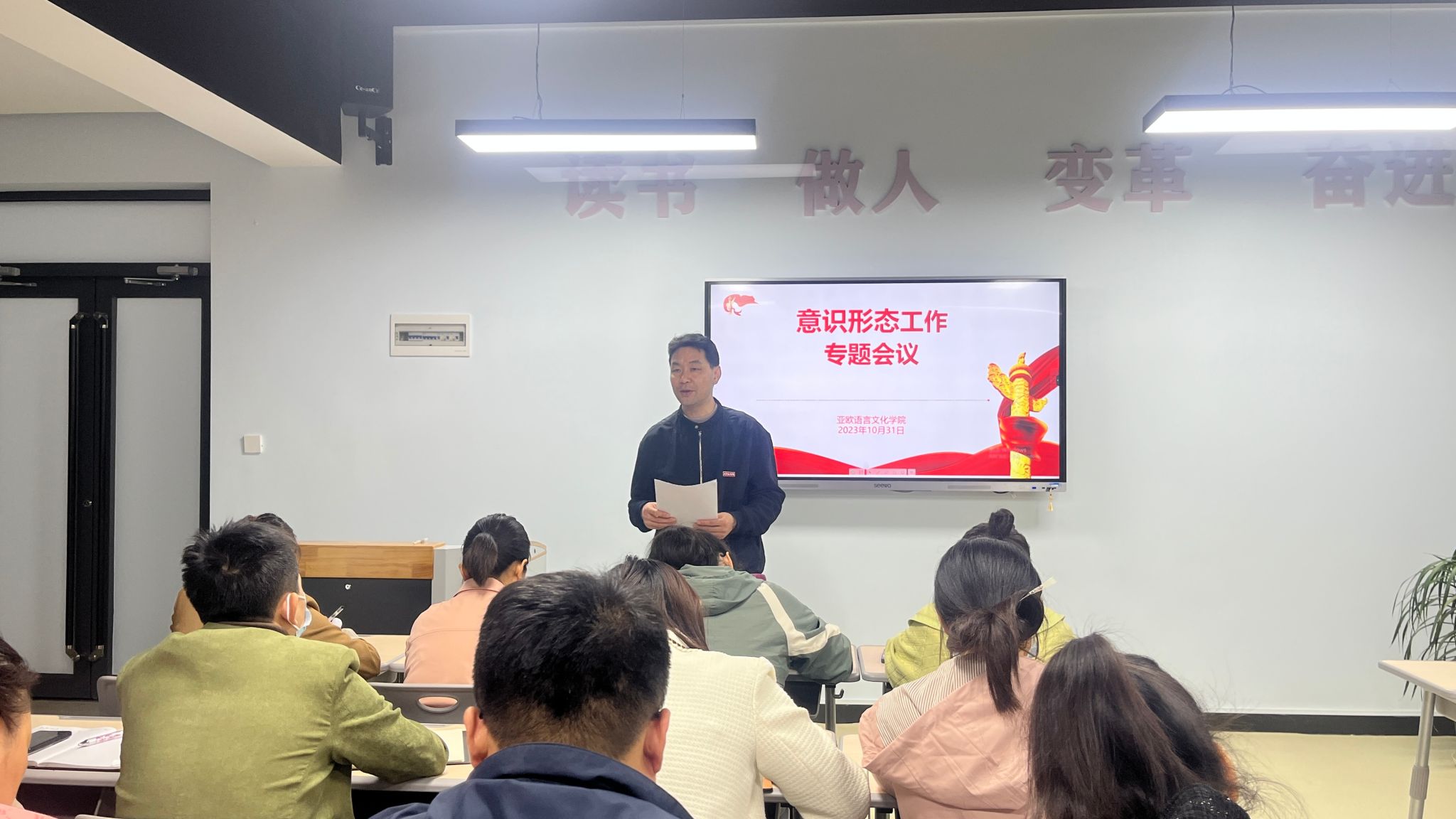 宇文永康指出,全体教职员工要增强底线意识和红线意识,提高自身政治素质和职业道德水平,力行师德规范,以良好的思想政治素质,崇高的人生追求和道德风范影响并引领学生健康成长,做党和人民满意的“四有好老师”,为学院及学校事业的发展营造良好氛围。他从以下五个方面做了强调:一是要高度重视意识形态工作,担当教师之责任;二是要加强教育引导,筑牢思想基础;三是严格师生管理,发挥党团示范引领;四要强化阵地建设,加强网络宣传引领,弘扬正能量;五是倡导党团共建,开展丰富多彩的第二课堂活动。最后,他希望全体师生进一步提高政治站位,全面认识和准确把握学校意识形态工作任务要求,不断筑牢意识形态工作的基层基础。