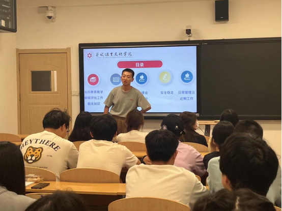 在各班班会上,辅导员首先向同学们讲解了审核评估对学校发展的意义以及审核评估的相关知识,鼓励同学们在迎评的关键时刻,树立“校兴我兴,校荣我荣”的大局意识,积极主动为迎评贡献自己的一份力量,同时,辅导员再次强调了大学生文明公约“十不准”,要求同学们严格要求自己,遵守学校日常行为规范,做好文明课堂、文明寝室、文明校园建设,自觉维护好西译学子的良好形象。
