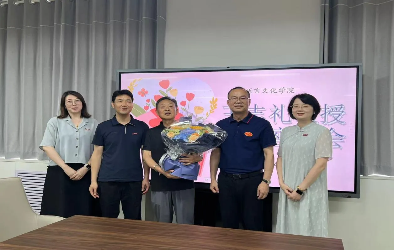 座谈会在热烈的掌声中迎来了最后一个环节——荣休仪式。学院领导为王教授颁发了荣誉奖杯和纪念品,全体教师与王教授合影留念。