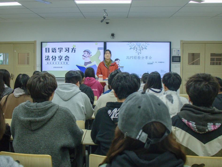 黄丽娜作总结讲话。她鼓励学生们要虚心学习他人的经验,结合自己的实际情况,制定出适合自己的学习计划,并通过建立学习小组、定期组织日语角纠音等活动将分享会中学到的经验运用到实际学习中,取长补短,共同进步。