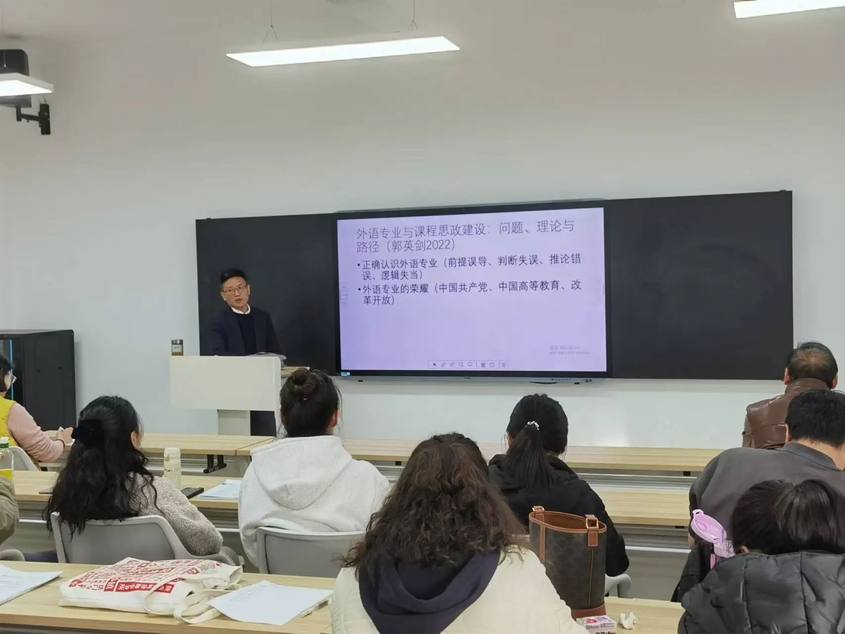张世胜教授首先从宏观角度对外语专业的课程思政进行政策解读,深入剖析了在新时代背景下课程思政的重要性和必要性。他强调,外语教学不仅仅是语言知识的传授,更是文化价值观的传递和思政教育的渗透。