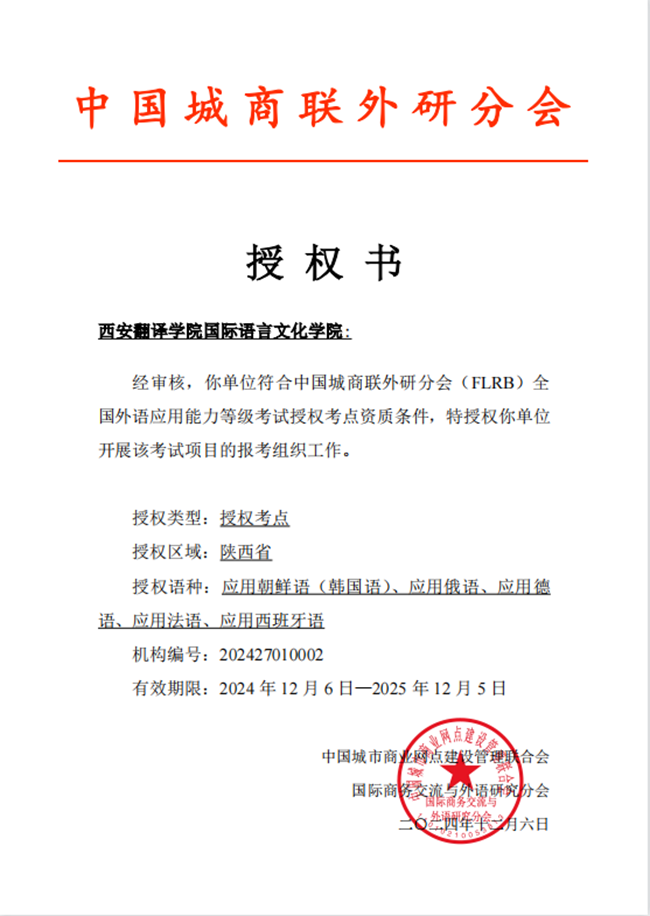 12月6日,我校今年会官方网站成为“FLRB全国外语应用能力等级考试” 授权考点,将开展应用俄语、应用法语、应用德语、应用朝鲜语(韩国语)、应用西班牙语五个语种的考试。这不仅标志着我校外语教学和人才培养质量得到国家层面的高度认可,也为广大学生提供了更多展示自身语言技能的平台。