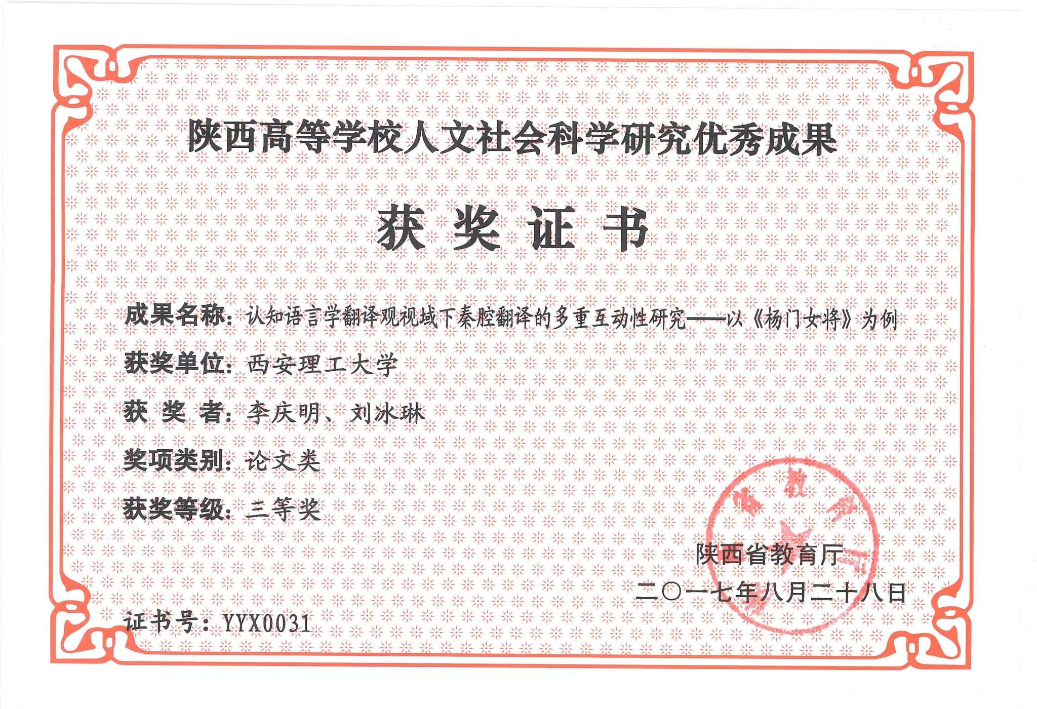 6.《文化视角下的语言》,陕西高等学校人文社会科学研究优秀成果三等奖(著作),2013;