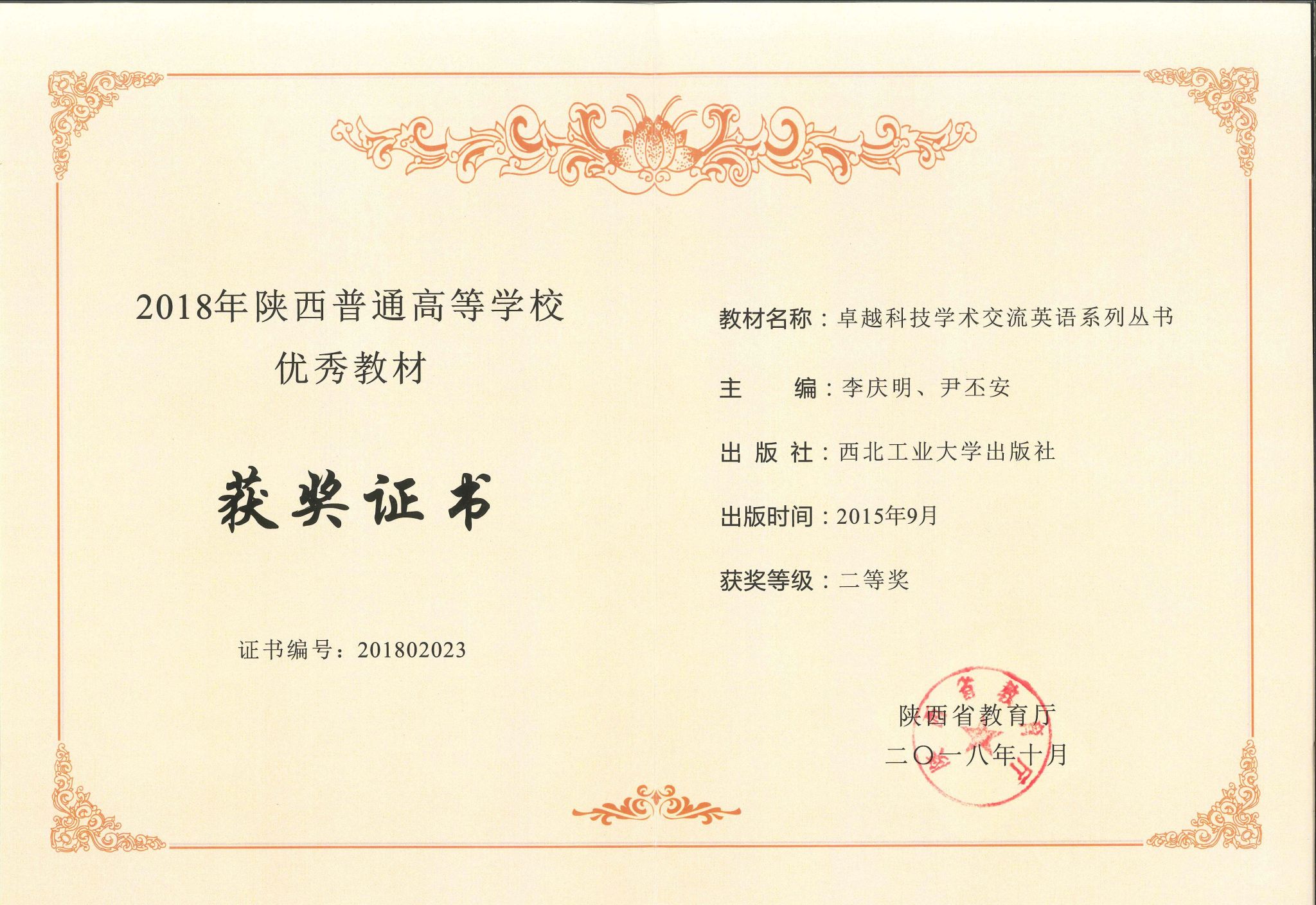 3.卓越科技学术交流英语系列丛书(6部),陕西省优秀教材二等奖,2018。